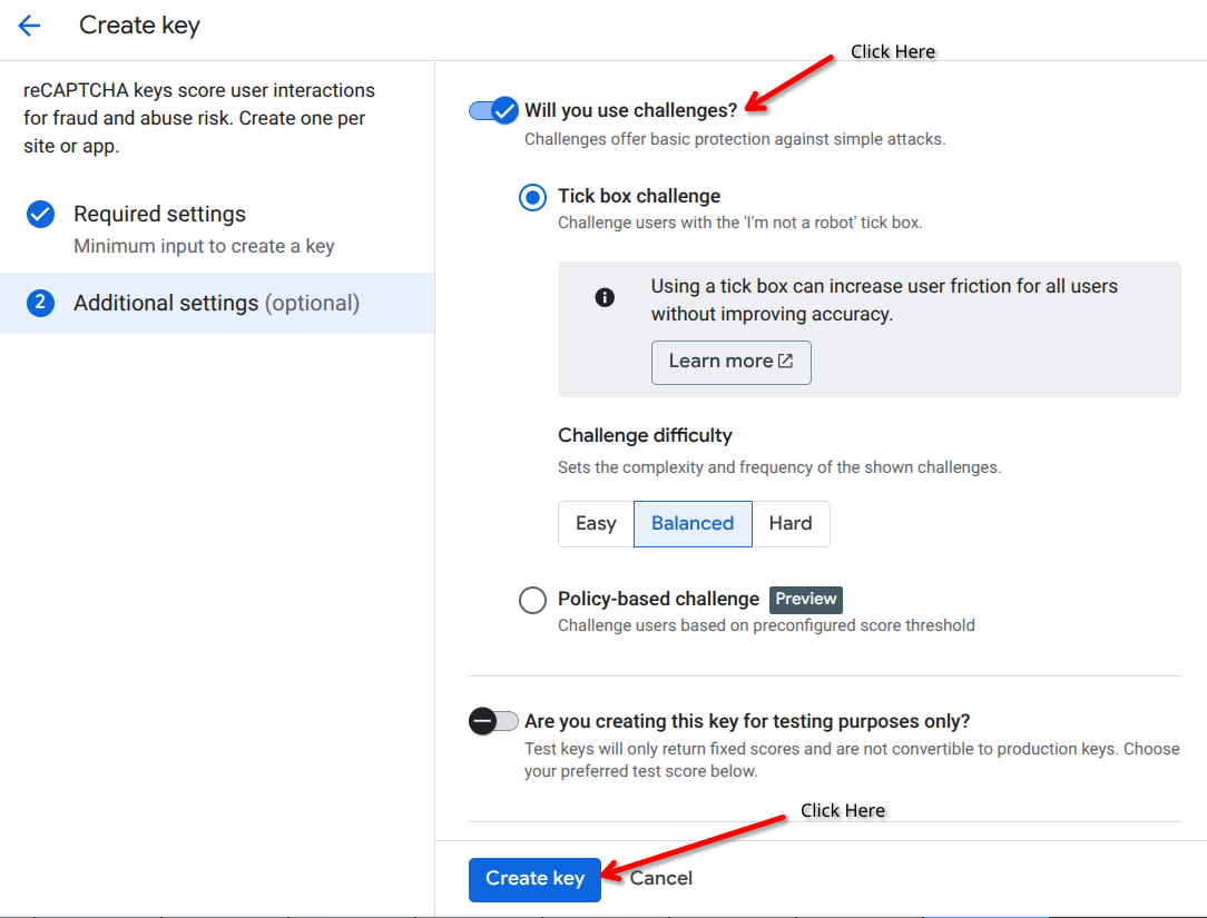 • Check mark “Will you use challenges?” and Click on “Create Key” button on bottom.