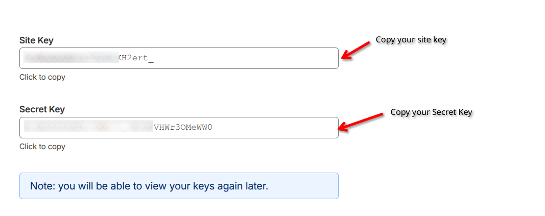• Now you will see “Site Key”, “Secret Key” like below, Copy and use it.